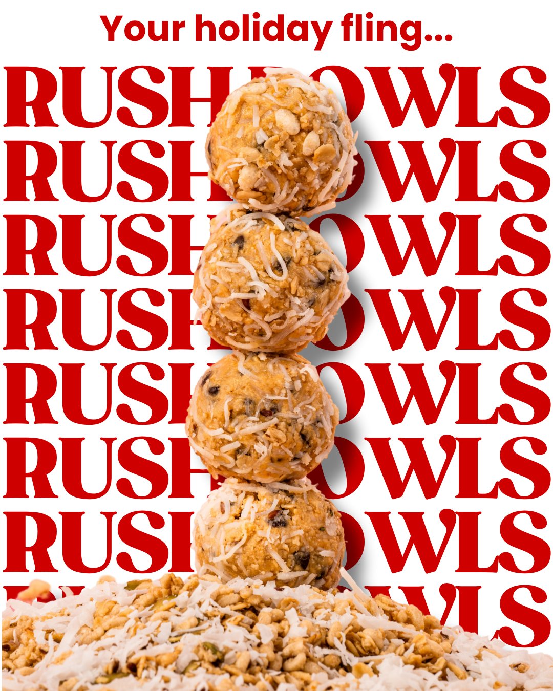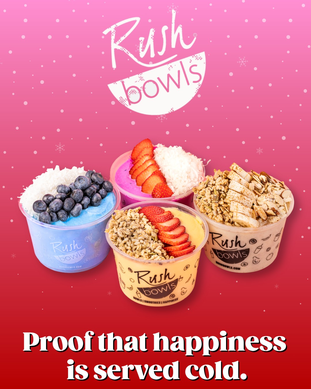 Rush Bowls are the perfect blend of all-natural fruits and veggies topped with delightfully crunchy, organic granola, a drizzle of honey, and your choice of fresh fruits and toppers. Packed with nutrients and fully customizable, Rush Bowls offer healthy, delicious alternatives to standard fast casual fare.